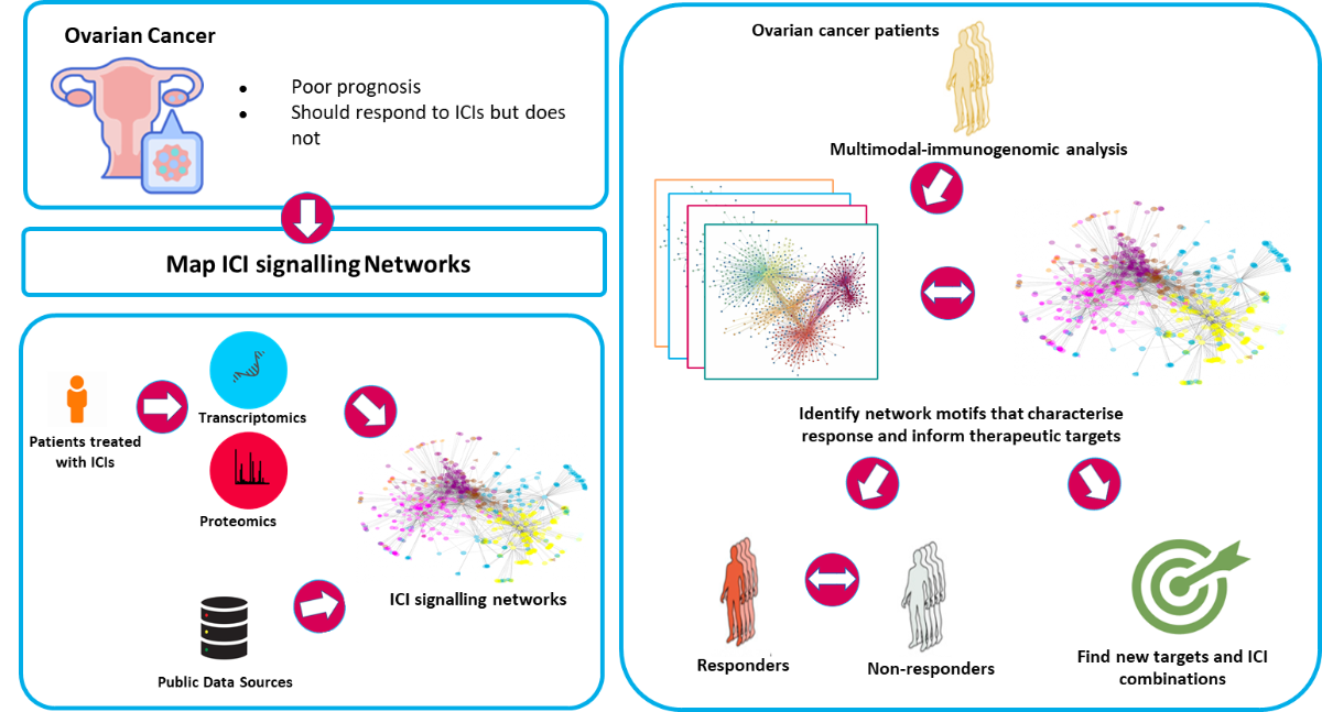 A focus on immunotherapies is a strategic priority for both SBI and the industry partner on this project, AstraZeneca (AZ), and research in this area will be of global impact. Therefore, computational scientists, biologists and clinicians from SBI and AZ have teamed up to analyse the molecular mechanisms of action of ICIs and use this knowledge to improve the development and deployment of ICIs. We are focusing on ovarian cancer as a poor prognosis cancer that should respond well to ICIs. To date response rates have been poor and large clinical trials have failed to demonstrate efficacy so we expect decisive improvements to be possible.